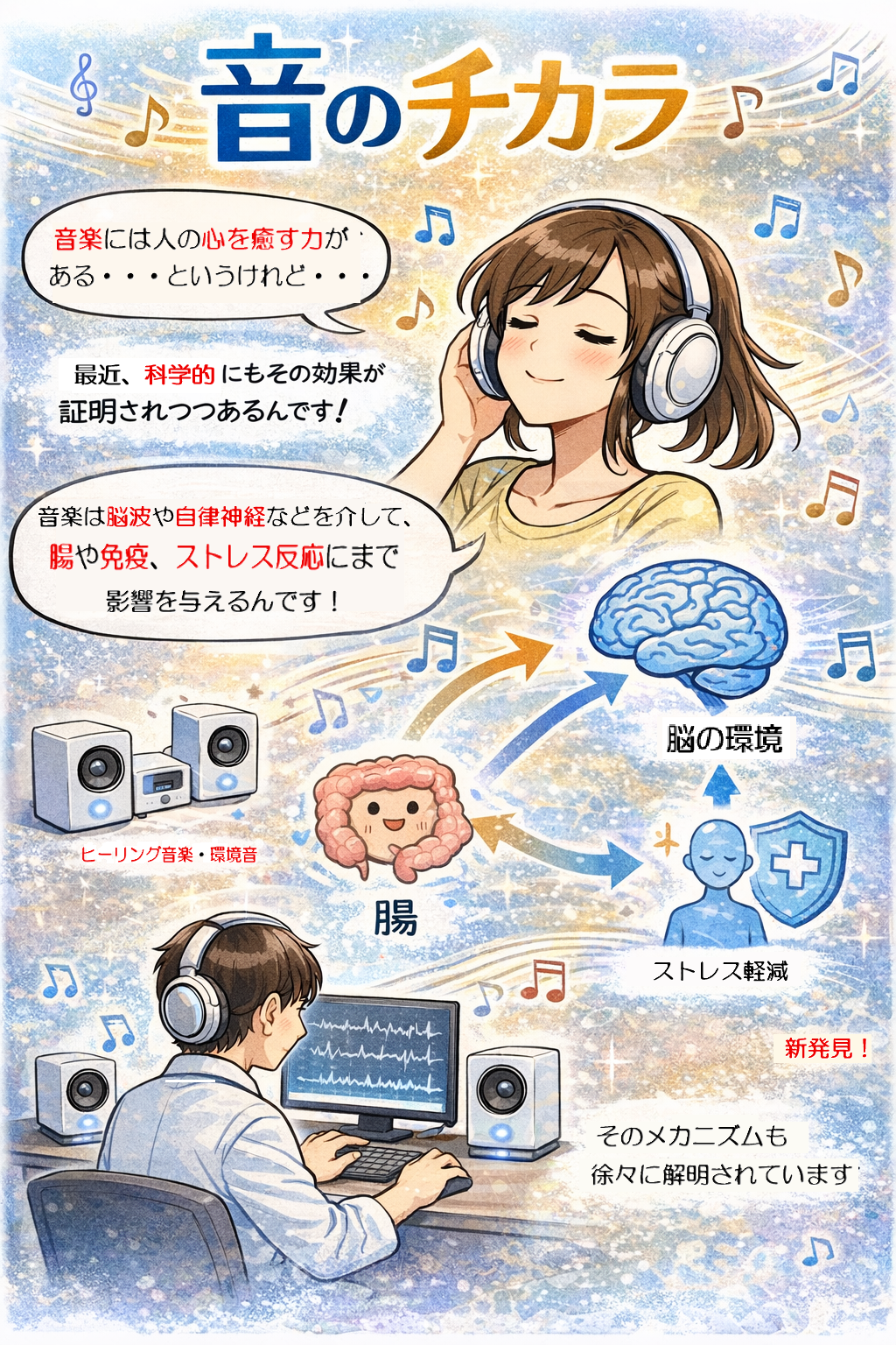 「音楽が人の心を癒やす」という言葉を、私たちはよく耳にします。近年の研究ではその効果が単なる感覚的なものではなく、科学的にも裏づけられた生理的変化であることが明らかになっています。音楽は脳波や自律神経を介して、腸や免疫、ストレス反応にまで影響を与える——そのメカニズムが徐々に解明されつつあります。なお、本コラムでは、音楽(音)のサンプルを再生できるようにしていますので、ご興味のある方は該当箇所をクリックやタップしてご試聴ください。