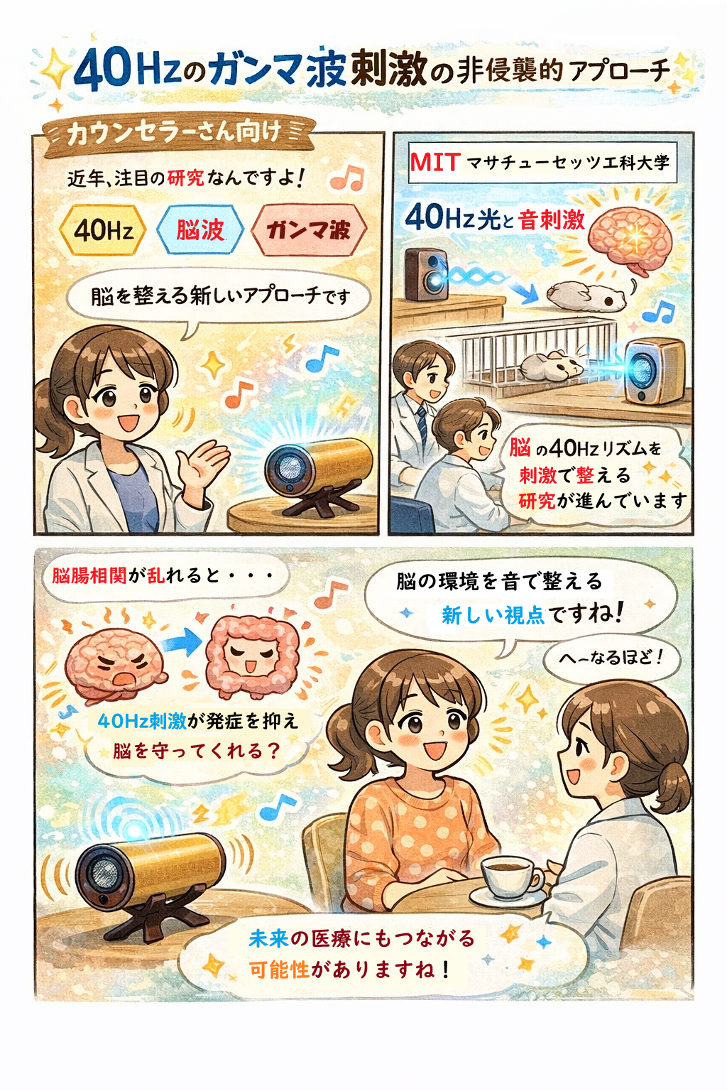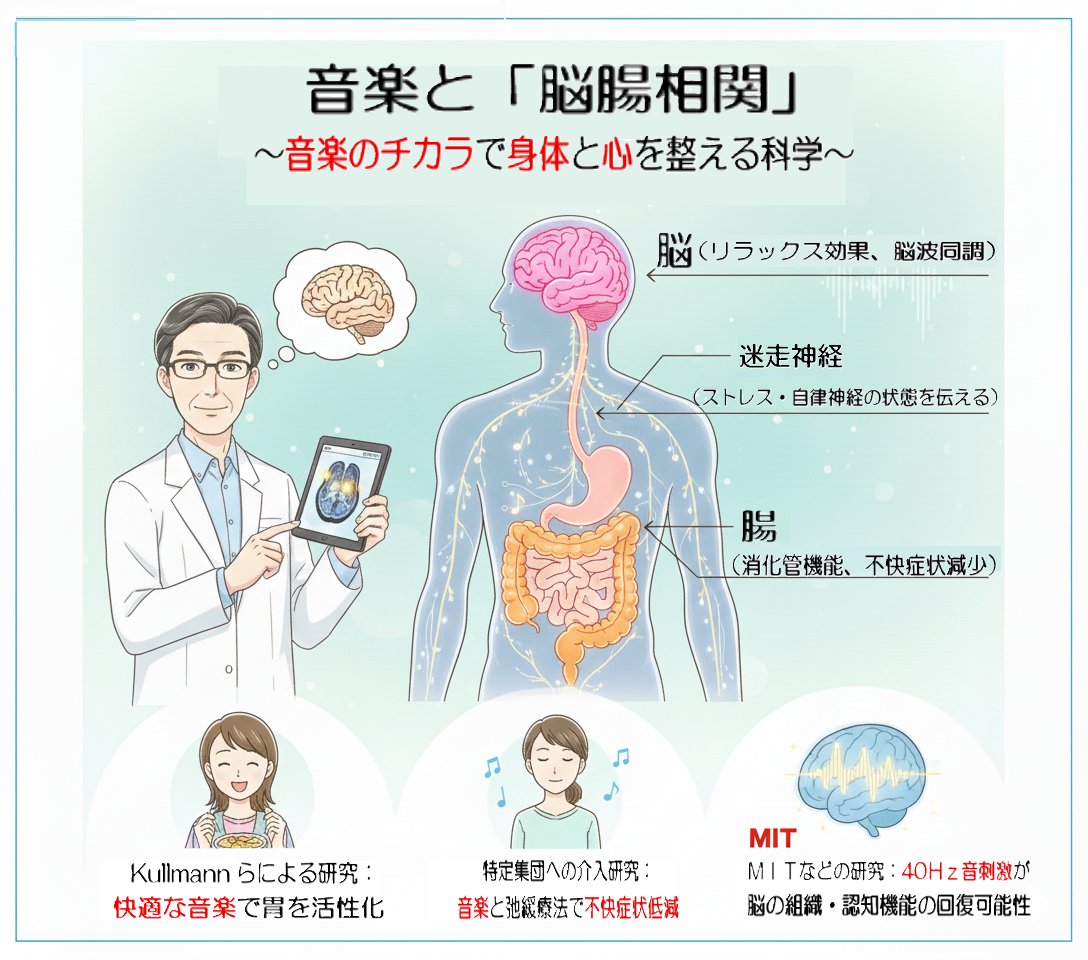 (太田先生のこぼれ話⑤)【最前線:40 Hzガンマ波刺激と脳腸軸への非侵襲的アプローチ】 本文で紹介した「40 Hzのガンマ波刺激は、単なるリラックス効果を超え、脳の恒常性(ホメオスタシス)の回復を促す可能性がある」という研究は、近年の神経科学分野における画期的な成果の一つです。では、なぜこの研究が「腸活」という文脈でも重要なのでしょうか。少しメカニズムを掘り下げてみましょう。 ガンマ波とは、脳が情報を統合したり、高度な注意・記憶・認知処理を行う際に出現する、おおよそ30〜100 Hzの高周波数帯の脳波です。アルツハイマー病などの認知機能障害では、このガンマ波の同期性(同調性)が低下していることが報告されています。 米国マサチューセッツ工科大学(MIT)の研究グループは、40 Hzの光刺激や音刺激を外部から与えることで、脳内の40 Hzリズムを非侵襲的に再同期させるというアプローチを提示しました。 この動物実験では、40 Hz刺激によって、「神経細胞周囲の病理学的変化の軽減」、「脳内免疫細胞であるミクログリアの活性化」、「血液脳関門(Blood–Brain Barrier, BBB)の機能維持」などが観察されました。これらは、脳内環境の恒常性維持に関与する重要な要素です。 ここで、「腸脳相関(gut–brain axis)」との接点が見えてきます。腸内環境が乱れ、慢性的な炎症やストレス状態が続くと、炎症性サイトカインが増加し、脳の神経炎症を助長する可能性が指摘されています。 40 Hz刺激が脳内炎症を抑制し、BBBの機能を保つ方向に働く可能性があるという知見は、腸由来の炎症シグナルが脳に及ぼす悪影響を、間接的に緩和する上流側の介入として捉えることができます。つまり、40 Hzの音刺激や音楽は、「腸の不調 → 炎症 → 脳機能への影響」という悪循環に対し、脳側から環境を整える非侵襲的アプローチとして将来的に位置づけられる可能性があるのです。 もちろん、現時点ではこれらは主に動物実験に基づく知見であり、人における臨床応用や治療効果を断定する段階ではありません。しかし、音や光といった身体を傷つけない刺激が、分子・細胞レベルの調節機構に関与し得るという発想は、音楽が「癒やし」を超えた生理学的意義を持つ可能性を示しています。そして、音楽が認知症の予防・改善に効果があるのではないかという知見は、今まさに、さまざまな研究で試みられています。 音楽による病気の治療――それはまだ未来の話かもしれませんが、音楽を生活習慣の一部として取り入れることが、心身の恒常性を支える一助になるという視点は、腸活や予防医学とも深く共鳴する考え方と言えるでしょう。 |