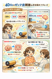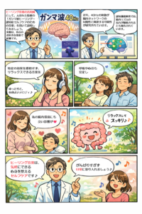近年、40Hz前後の周期的刺激が、注意・記憶・感情調整などに関与する脳内ネットワークの同期性と関連する可能性が報告されています。なお、神経科学分野の研究では、アルツハイマー病を含む認知機能障害の病態において、ガンマ波活動の乱れが観察されることが報告されており、脳内リズムの変調が神経ネットワーク機能と関係する可能性が指摘されています。これらは基礎研究・観察研究に基づく知見であり、特定の介入や音刺激の有効性を示すものではありません(ご興味のある方は、囲み記事<(太田先生のこぼれ話⑤)【最前線:40 Hzガンマ波刺激と脳腸軸への非侵襲的アプローチ】>をご参照ください)。