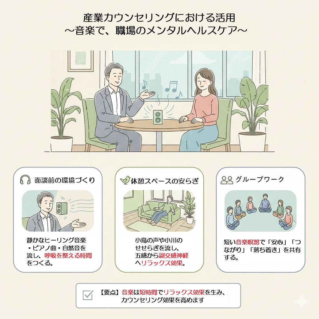 職場では、過労や対人ストレスによって交感神経が優位となり、腸内環境が乱れやすくなります。産業カウンセリングの現場で音楽を取り入れることは、短時間でリラックス反応を引き出す具体的手段となります。