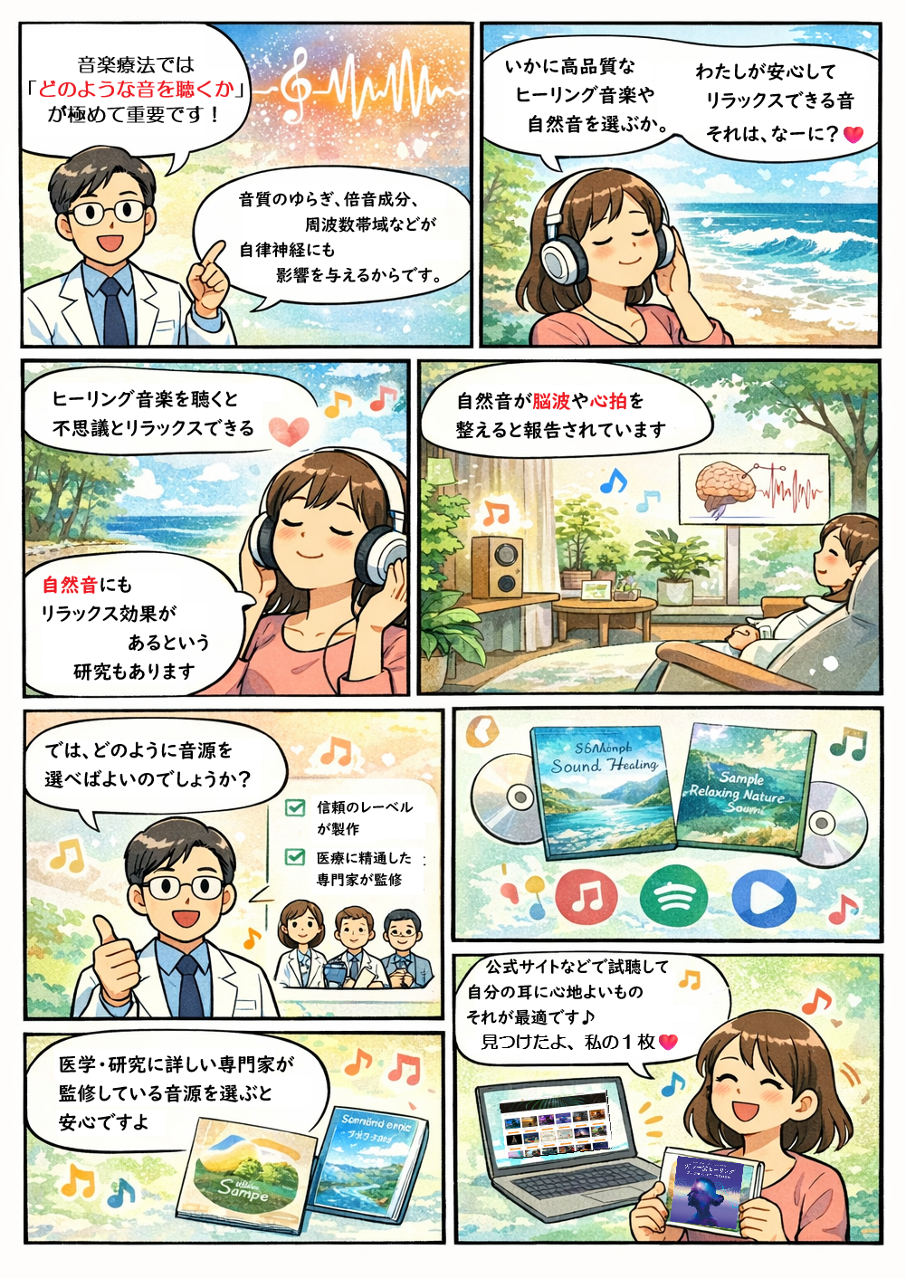 どのような音源を選べばよいのか、迷われる方も多いと思います。一つの目安としては、信頼できるレーベル(音楽会社)が制作し、医学に精通した専門家・研究者が監修している製品を選ぶと安心でしょう。最近では、多くの企業が公式サイトなどで音源を試聴できるようにしていますので、最終的にはご自身の耳で聴いて心地よいと感じるものを選ぶことは一案です。