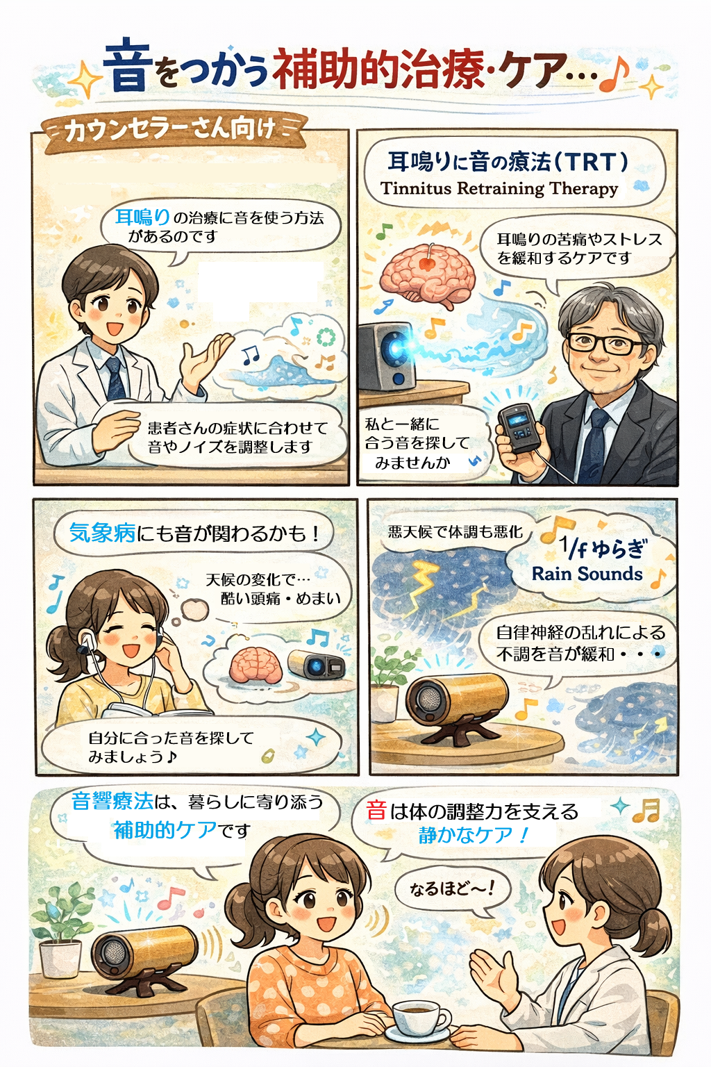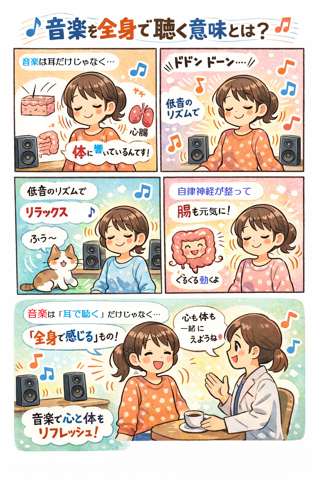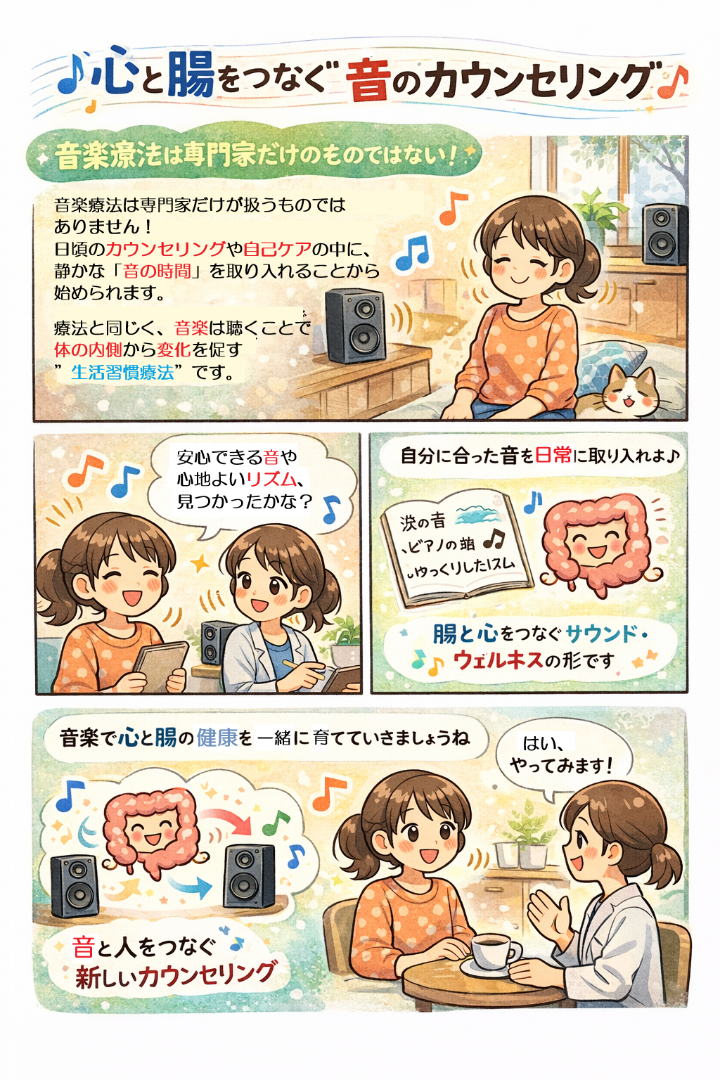 クライエントが「安心できる音」「落ち着くリズム」を見つけ、それを日常に取り入れることは、自己理解とセルフケアの促進につながります。腸と心、音と人をつなぐカウンセリング——それが、これからの時代の“サウンド・ウェルネス(音の健康法)”の形なのです。