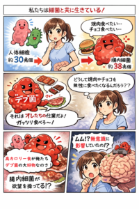 例えば、先日あなたが食べた焼肉やチョコレートも、純粋にあなた自身の意思だけで選ばれたものではなく、腸内細菌の代謝特性が無意識の選好に影響していた可能性も考えられます。