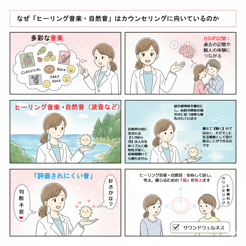 だからこそ、カウンセリングやセルフケアの文脈では、「どんな音楽でもよい」のではなく、脳と身体に過剰な予測や感情喚起を生じさせにくい音環境を選ぶという視点が意味を持ってきます。