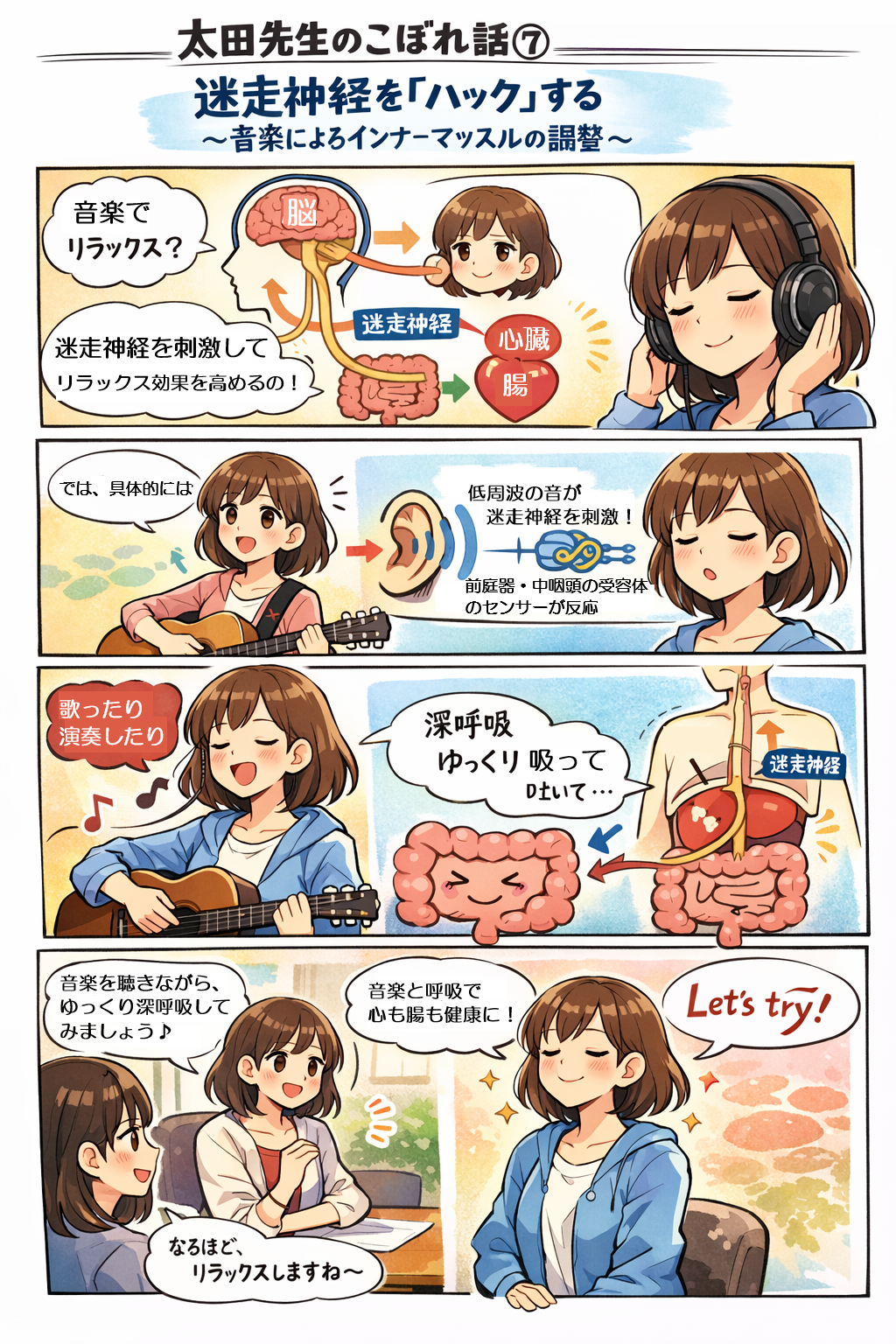 (太田先生のこぼれ話⑦)【迷走神経を「ハック」する~音楽によるインナーマッスルの調整】 本文では、音楽が自律神経(迷走神経)を介して腸に影響を与えると述べましたが、より具体的に、音楽が迷走神経をどのように刺激するのかを考えてみましょう。 迷走神経は、呼吸や心拍、そして消化管の運動を支配する副交感神経の主幹です。この神経の活動性が高いほど、リラックスした状態にあると言え、「迷走神経トーン(Vagal Tone)」として心拍変動などから評価されます。迷走神経トーンが高い人は、ストレスへの耐性が高く、炎症反応が低いことが知られています。 音楽療法が目指すのは、この迷走神経トーンを意図的に高めることです。 特に効果的なのは、ゆったりとしたテンポの音楽や、低周波の音です。低周波の音は、耳の奥にある前庭器や、迷走神経が分布する中咽頭の受容体を刺激し、直接的に迷走神経を介したリラックス反応を引き出す可能性があります。 また、歌や演奏、または呼吸法と組み合わせた聴取など、「能動的な音楽への関与」は、横隔膜の動きを深め、結果として横隔膜の近くを通る迷走神経を間接的に刺激する可能性があります。つまり、音楽に合わせて意識的に呼吸を整える行為(または音楽に誘発される自然な呼吸の変化)は、迷走神経を刺激する一種のインナーマッサージとして機能する可能性があるのです。 カウンセリングにおいて、クライエントに音楽を流すだけでなく、「音楽を聴きながら、ゆっくりと深く息を吸い、長く吐く」という簡単な指導を付け加えるだけで、音楽の迷走神経刺激効果は飛躍的に高まり、腸活への貢献も期待できるでしょう。あなたもぜひ、カウンセリングの現場で試してみてはいかがでしょうか。 |