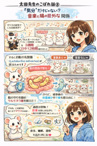 これらの知見は、音刺激や音楽が自律神経を介して腸の働きや心身の状態に影響を与える可能性を示唆するものと考えられます。
