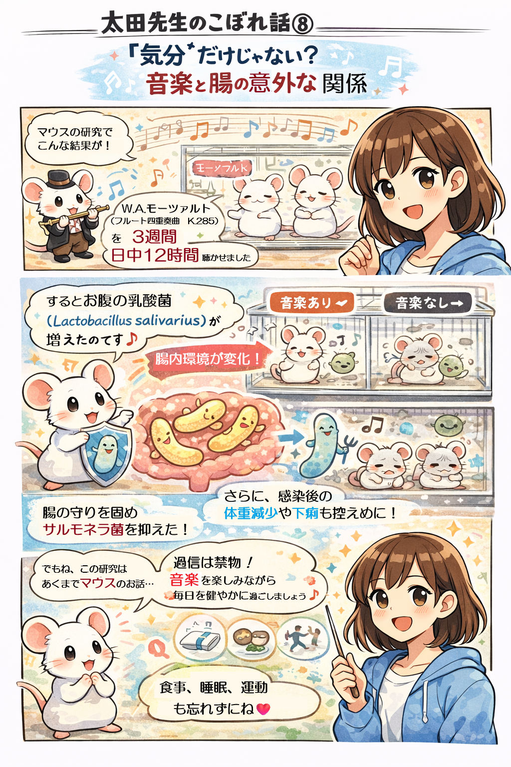 (太田先生のこぼれ話⑧)【「癒やし」だけではない? 医療現場で用いられる音と身体反応】 音楽は単に「気分を落ち着かせる」だけのものではありません。近年、音や音楽が自律神経系、内分泌系、そして免疫系を介して、生体のホメオスタシス(恒常性)に深く関与している可能性が、基礎研究・臨床研究の両面から報告されつつあります。 その興味深い一例として、マウスにモーツァルト(フルート四重奏曲K.285)(※6)を聴かせた研究を紹介します。 3週間、日中12時間音楽を聴取させた結果、腸内細菌叢の構成が変化し、特に有用な乳酸菌(Lactobacillus salivarius)が増加する傾向が観察されました。さらに、サルモネラ菌を感染させた実験では、音楽を聴いた群で体重減少が軽度にとどまり、腸内のサルモネラ量も有意に少ないことが報告されています。 この現象の背景には、「脳腸相関(Brain-Gut Axis)」と呼ばれるメカニズムの存在が示唆されます。聴覚刺激が脳のストレス中枢への入力を緩和し、迷走神経(副交感神経)を介して腸管の免疫機能や粘液分泌に影響を与えた結果、細菌叢のバランスが整い、病原菌の増殖抑制(酸性化環境の形成など)につながったと考えられます。 もっとも、これはあくまでマウスを用いた基礎研究であり、ヒトにおいて全く同様の現象が再現されるかは検証が必要です。したがって、「音楽を聴けば感染症を防げる」と短絡的に解釈することは適切ではありません。