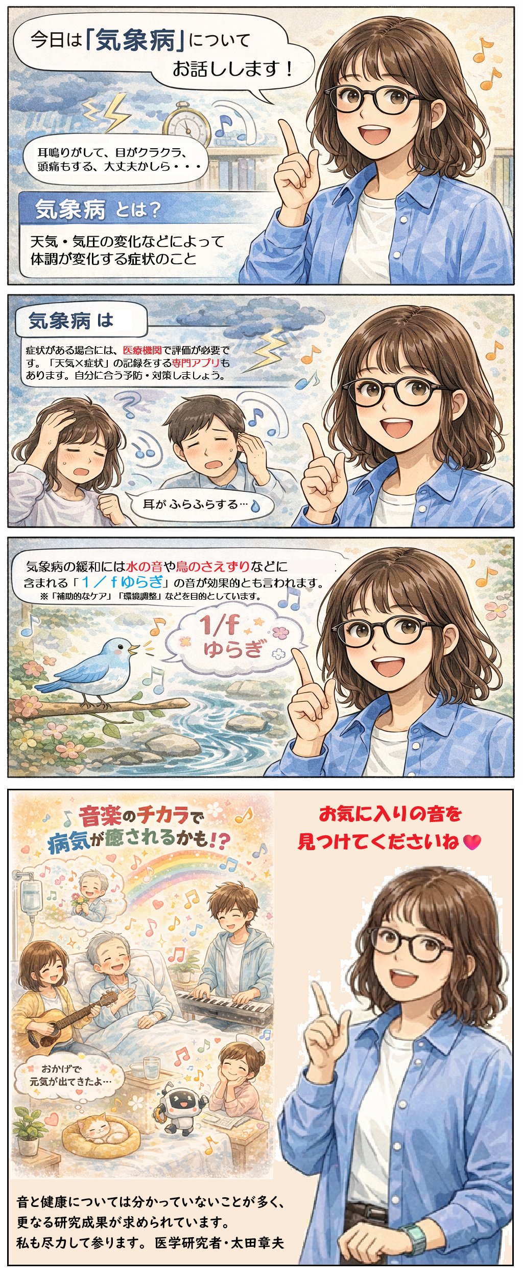 これらは、音楽や音が直接病気を「治す(Cure)」ものではなく、身体が本来持つ調整機能を支える「ケア(Care)」の補助的手段として位置づけられます。腸活と同様に、食事・睡眠・運動といった基本を大切にした上で、音を生活環境の一部として戦略的に取り入れる——その距離感が、医学的にも現実的で安全と言えるでしょう。 音は、まだ解明途上ではありますが、医学と日常生活をつなぐ静かなツールとして、今後さらに研究が進むことが期待されています。将来的には、個人の状態や嗜好に合わせて設計されたオーダーメイドの音楽や自然音が、セルフケアや予防的健康管理に活用される時代が来る可能性もあるといえるでしょう。 |